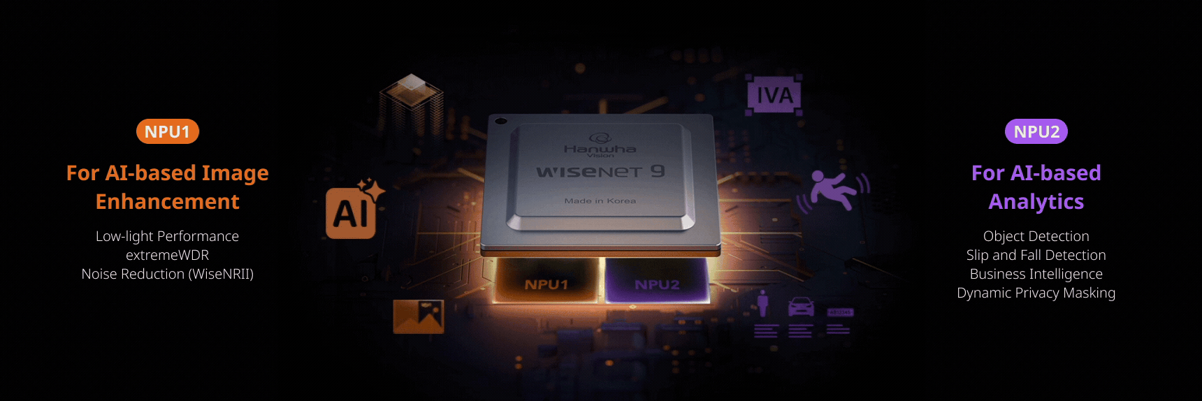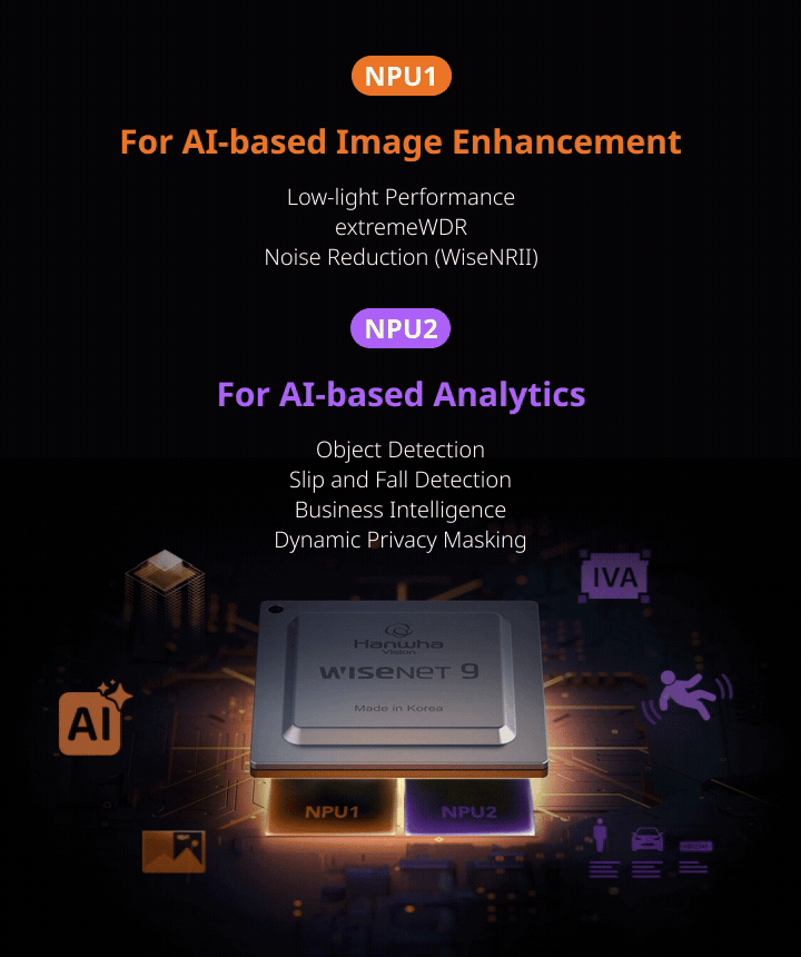 At the core of the T Ruggedized PTZ cameras is the Wisenet 9 SoC with a Dual NPU architecture. This design separates image processing and AI analytics, ensuring each operates at full capacity without interference. The result is consistently superior low-light and WDR performance alongside fast, reliable AI analytics — even under demanding workloads. WiseStream compression further optimizes bandwidth and storage without losing detail, making it ideal for large-scale, mission-critical surveillance.