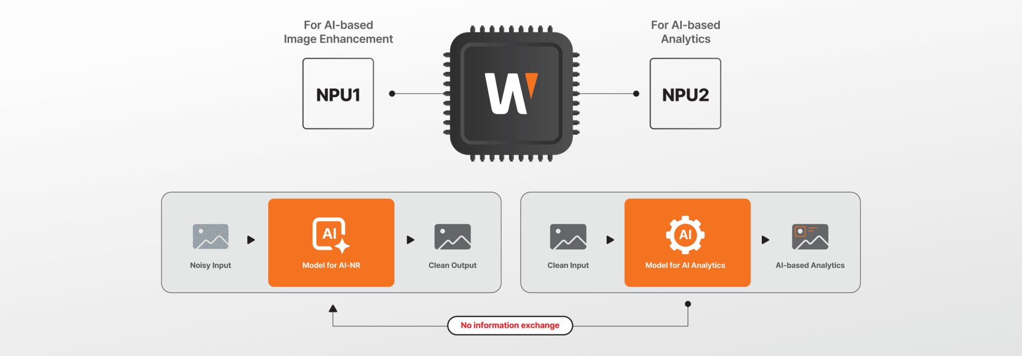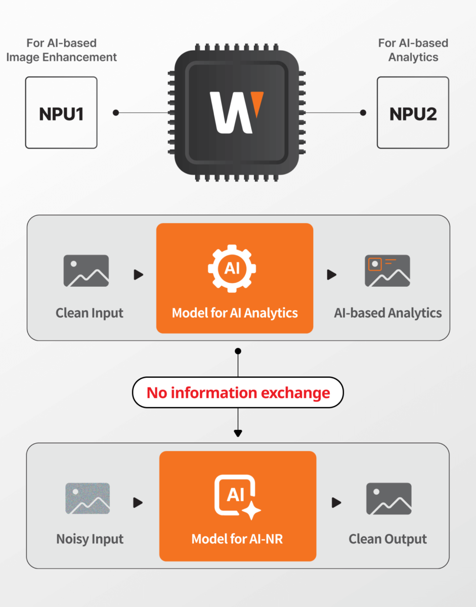 At the heart of AI-based Image Enhancement lies the Dual NPU architecture of the Wisenet 9 SoC. This powerful design separates image processing from analytics, allowing each neural processor to operate independently for maximum efficiency. With one NPU dedicated to visual enhancement, it precisely controls exposure, noise reduction, and shutter optimization — delivering sharper, clearer, and more dynamic images under any lighting condition.
