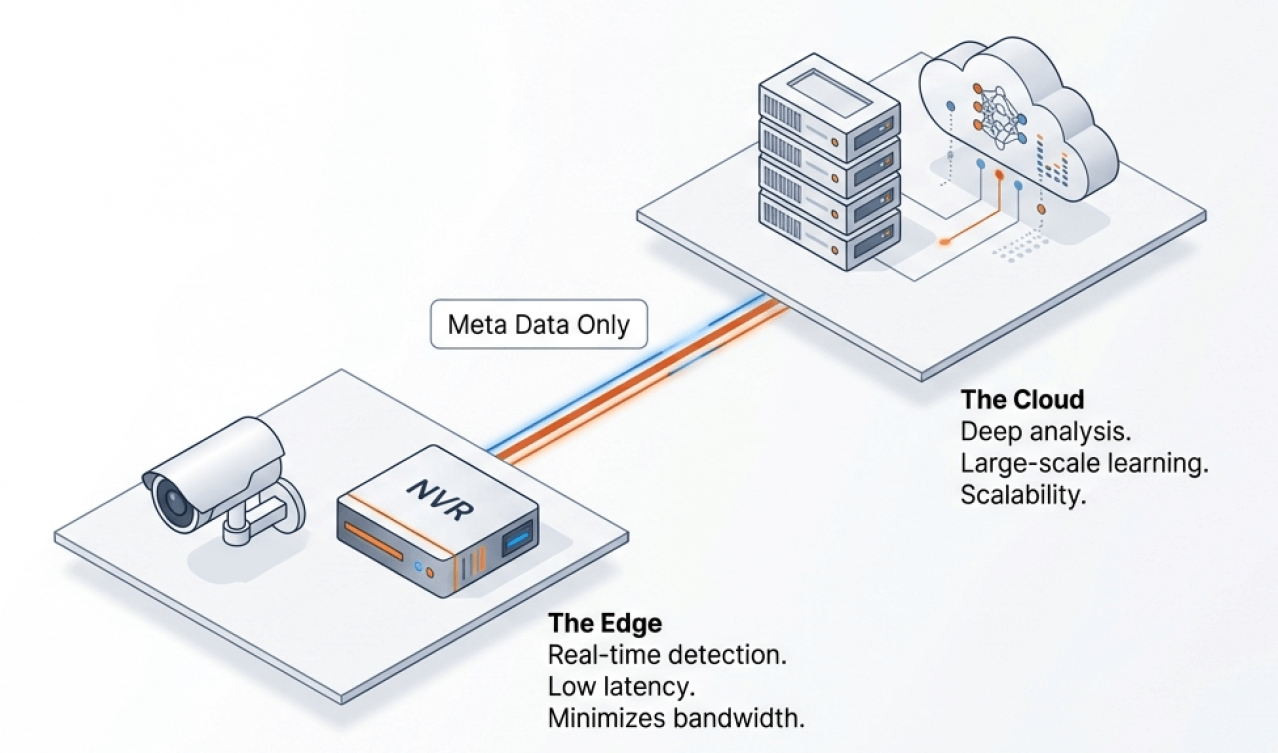 This architecture allows for a more efficient distributed computing structure. On-premise edge devices (cameras/NVRs) handle the first layer of real-time detection, minimizing bandwidth strain by only transmitting essential data. The cloud then performs a second layer of deep analysis and large-scale learning, significantly sharpening the accuracy of AI functions.