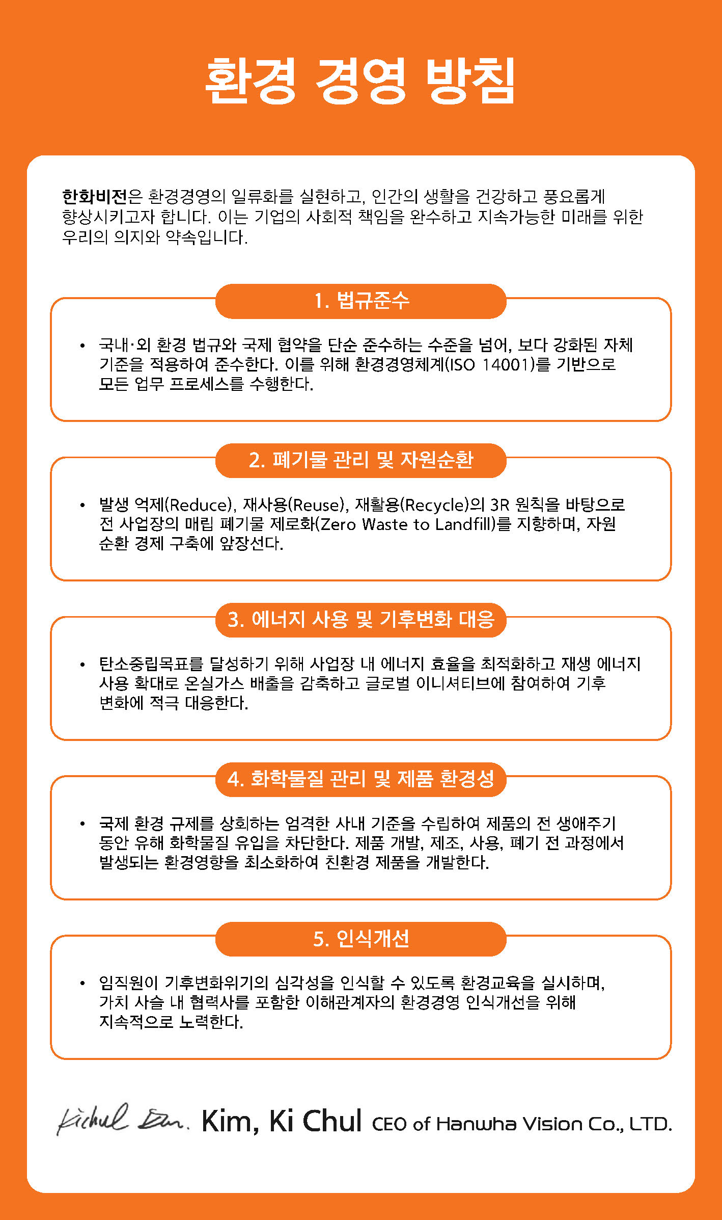 한화비전은 인체와 환경에 미치는 영향을 최소화 하고, 유한한 자원을 효율적으로 사용함으로써 쾌적한 삶과 환경의 질(質)을 유지하여 친 환경 기업으로서의 책무를 다하고자 다음과 같이 기본 원칙을 준수한다.
