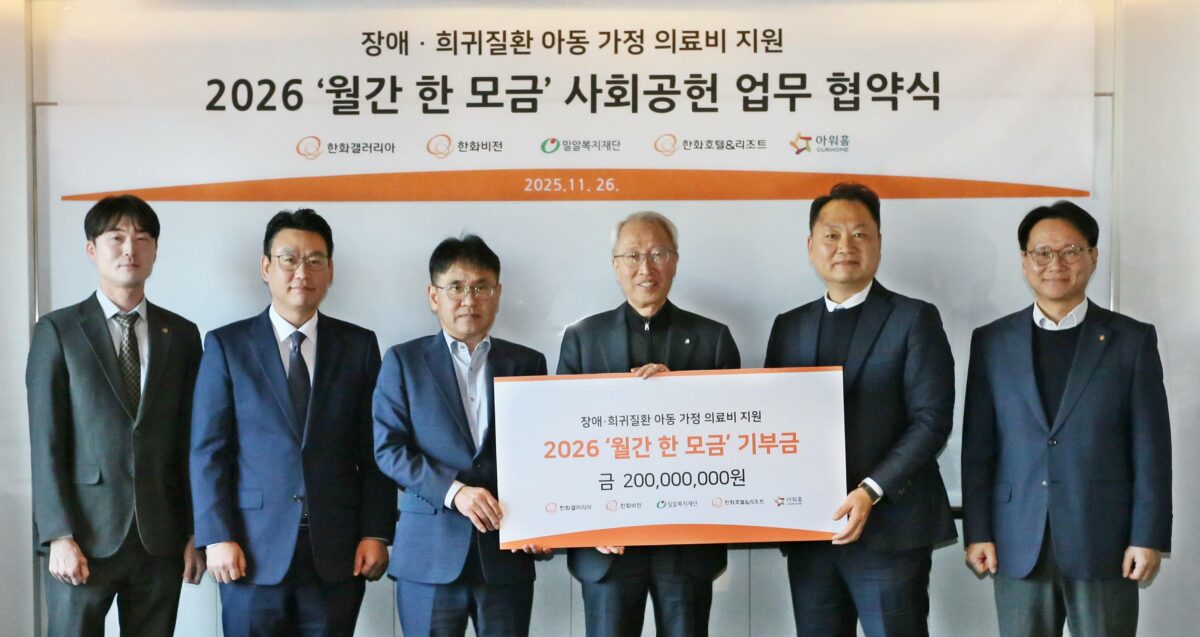 <월간 한 모금>은 저소득 장애 아동 가정의 의료비 부담 경감과 아동의 빠른 회복을 돕기 위해 기획됐다. 한화비전과 아워홈이 새롭게 합류하면서 더 많은 장애 아동 가정에 필요한 도움을 줄 수 있을 것으로 기대 된다.