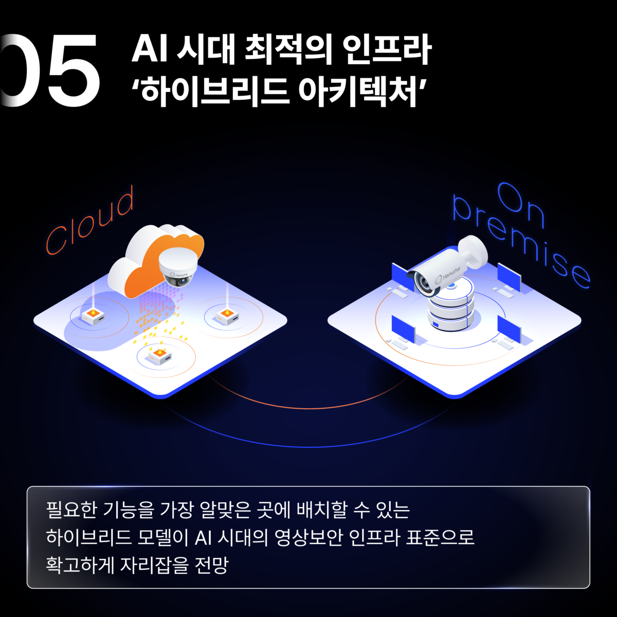 고화질 영상 데이터의 급증으로 인해 발생하는 데이터 전송 비용과 지역별 데이터 주권 및 규제 문제가 클라우드 기반 시스템 운영상의 제약으로 대두되고 있다. 이러한 배경 속에서 클라우드의 가치는 유지하면서도 운영 부담을 해소할 수 있는 하이브리드 아키텍처가 영상보안 분야 최적 솔루션으로 빠르게 자리 잡고 있다. 2026년에는 이러한 하이브리드 모델이 AI 시대의 보안 인프라 표준으로 확고하게 정착될 전망이다.
