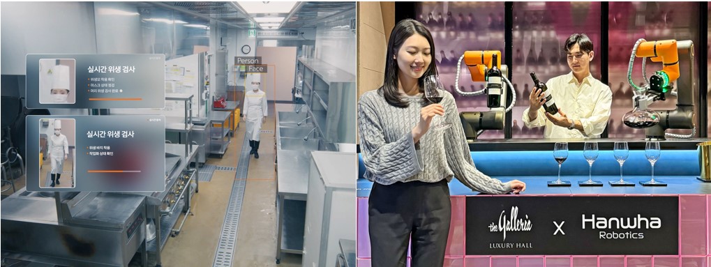 AI 카메라에 이상 상황이 포착되면 직원에게 곧바로 알림을 보내 대응하도록 하는 시스템도 구축한다. 각 사 F&B 부문은 비노봇(VINOBOT), 조리로봇과 같이 한화로보틱스의 협동로봇을 고객 서비스에 적극 활용한다는 계획이다.
