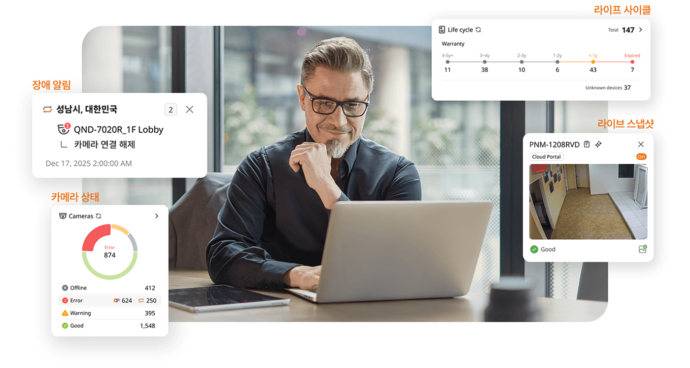 Device health dashboard 보유 디바이스의 실시간 상태를 하나의 대시보드에서 확인하세요. 장비 현황, CPU·RAM·POWER 사용량, 플래시 메모리 상태, 오픈 앱 및 AI 기능 상태, 장애 현황까지 한눈에 진단하고 효과적인 대응이 가능합니다. (*Axis, i-PRO, ONVIF 지원)