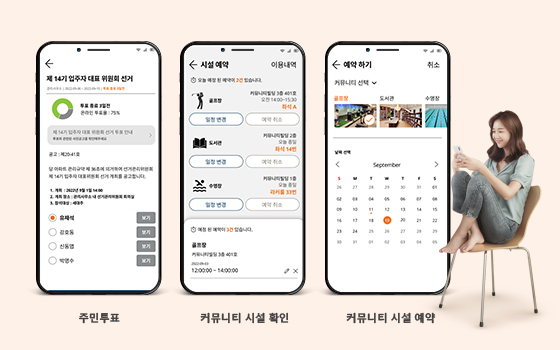 내 차 찾기 , 선호 주차구역 설정 , 방문 차량 등록 커뮤니티 예약 등 생활 편의 서비스를 제공합니다.