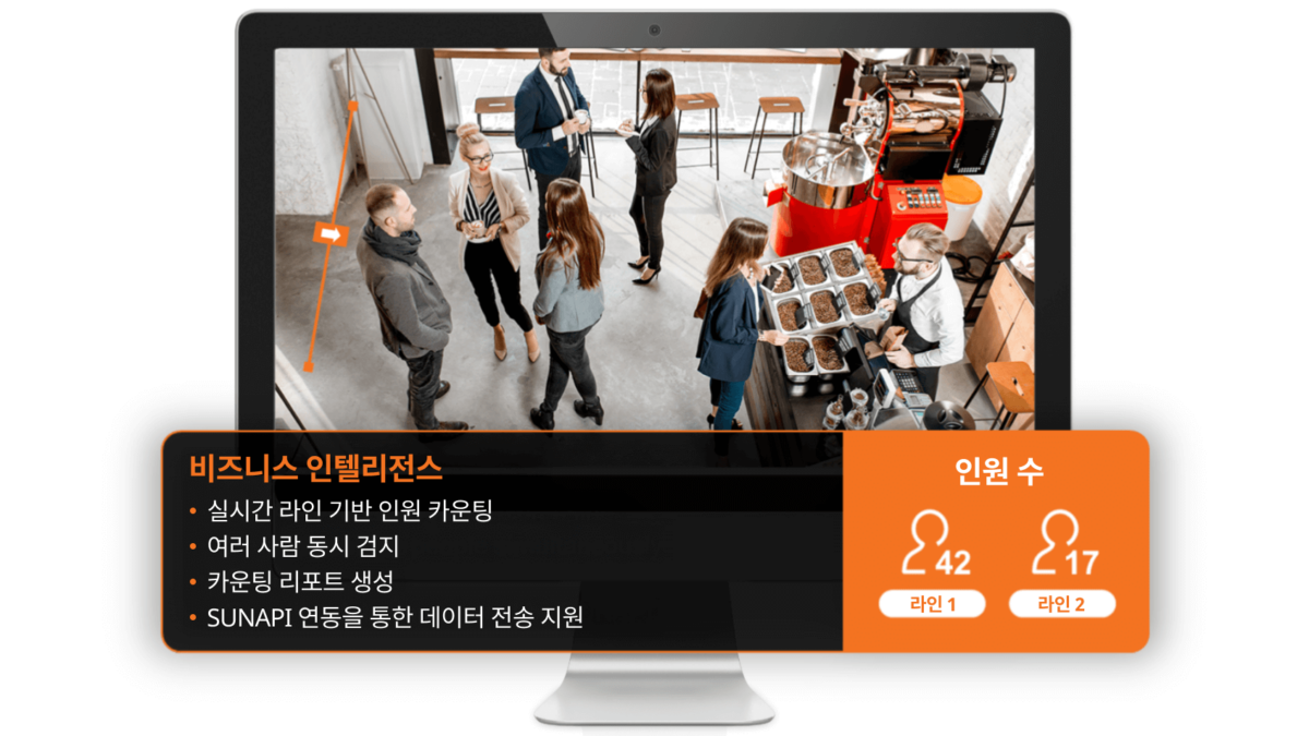 피플 카운팅 기능은 가상 라인을 기반으로 지나가는 사람을 실시간으로 정확하게 검지해 여러 명이 동시에 움직일 때도 개별적으로 카운팅합니다. 시스템은 자동으로 카운팅 리포트를 생성하며, SUNAPI를 통해 외부 시스템으로 데이터를 전송해 분석·운영 솔루션과 매끄럽게 연동할 수 있습니다.
