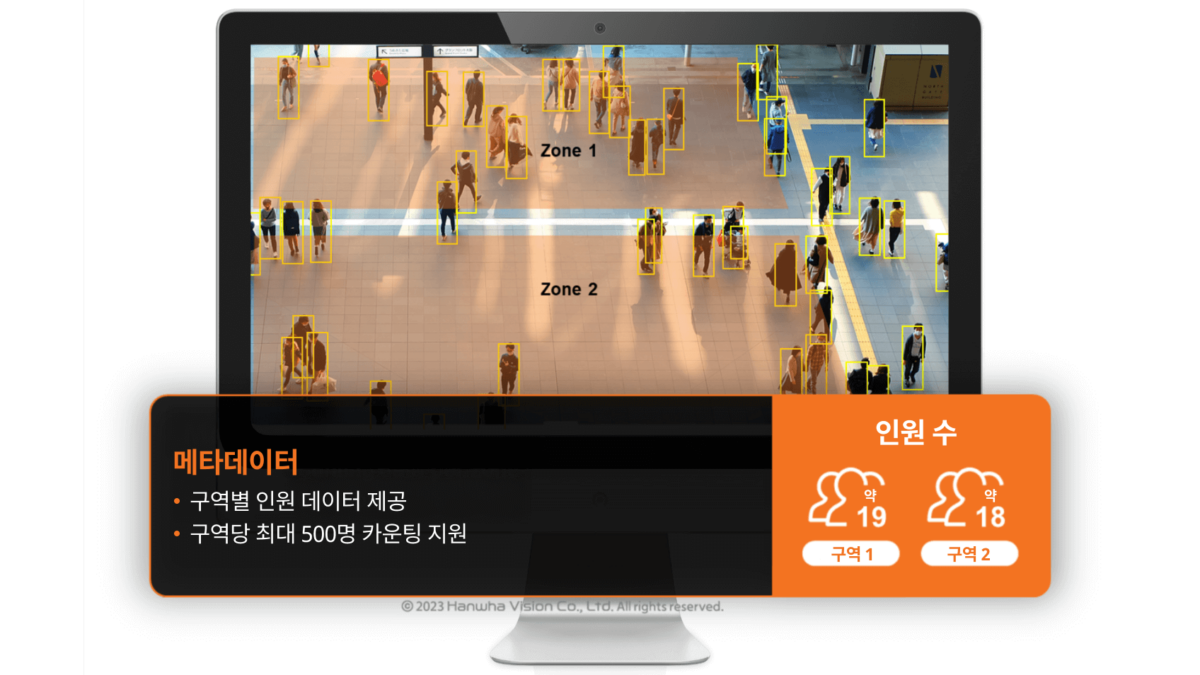 한화비전의 AI 기반 분석 기술은 영상에서 얻는 시각 정보를 실시간 데이터로 전환합니다. 객체, 움직임, 행동, 밀집도 등을 이해해 정확한 알림, 신뢰할 수 있는 통계, 그리고 기존 모션 검지를 뛰어넘는 운영 인사이트를 제공합니다.