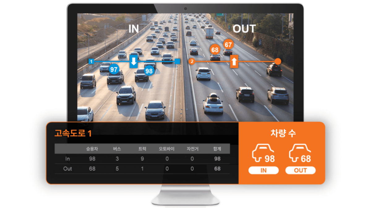 차량 카운팅 기능은 지정된 구역을 통과하는 차량을 실시간으로 검지하고 분류하여 정확한 통행량 데이터를 제공합니다. 교통 흐름을 지속적으로 추적함으로써 주차장 운영, 도시 교통 관리, 물류 거점, 톨게이트 시스템 등 다양한 환경에서 활용할 수 있는 신뢰도 높은 정보를 제공하며, 혼잡 분석, 인프라 계획, 운영 최적화를 효과적으로 지원합니다.