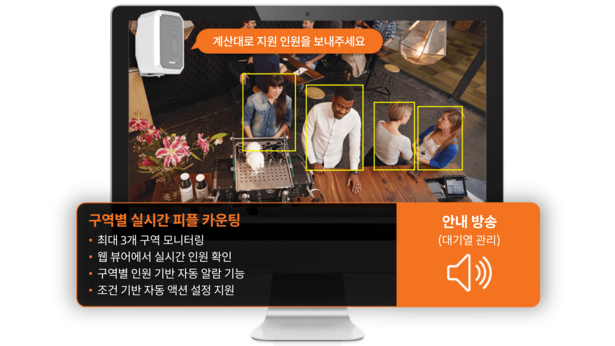 대기열 관리 기능은 최대 3개의 대기 구역을 동시에 모니터링하며, 웹 뷰어에서 각 구역의 실시간 인원 정보를 직관적으로 확인할 수 있습니다. 구역별 인원 수에 따라 자동으로 알람을 발생시켜 혼잡이 발생하기 전에 빠르게 대응할 수 있도록 돕고, 사전에 정의된 조건에 맞춰 자동 액션을 실행하는 이벤트 설정도 지원합니다. 이를 통해 매장·시설 운영자는 대기열 증가, 결제 대기, 서비스 지연 등 혼잡 요인을 신속하게 관리할 수 있습니다.
