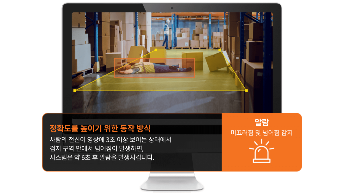 넘어짐 & 쓰러짐 검지 기능은 사람의 전신이 검지 구역 내에서 3초 이상 확인된 상태에서 보행 자세에서 넘어짐 상태로 급격히 변화하면 이를 검지합니다. 시스템은 상황을 즉시 검증한 뒤 약 6초 이내에 알람을 발생시켜 빠른 대응을 지원하는 동시에 불필요한 오경보를 최소화합니다.