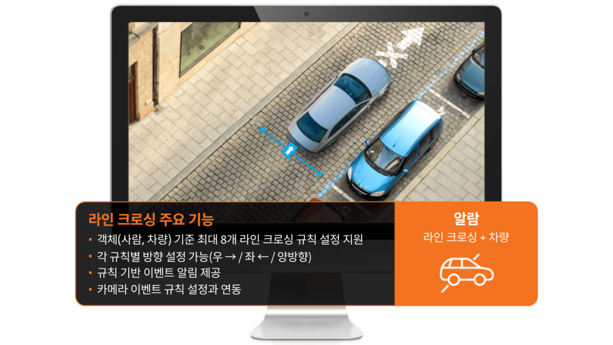 AI 기반 라인 크로싱(Line Crossing) 및 IVA 영역 검지 기능은 가상의 선과 지정 구역을 실시간으로 모니터링합니다. 사람과 차량을 지능적으로 식별하여, 유효 객체가 선을 통과하거나 제한 구역에 진입할 때만 경보를 발생시킵니다. 픽셀 기반 방식과 달리 그림자, 반사, 불규칙한 움직임에 영향을 받지 않아 시설, 경계 구역 등에서 더욱 정확한 침입 검지와 구역 모니터링이 가능합니다.