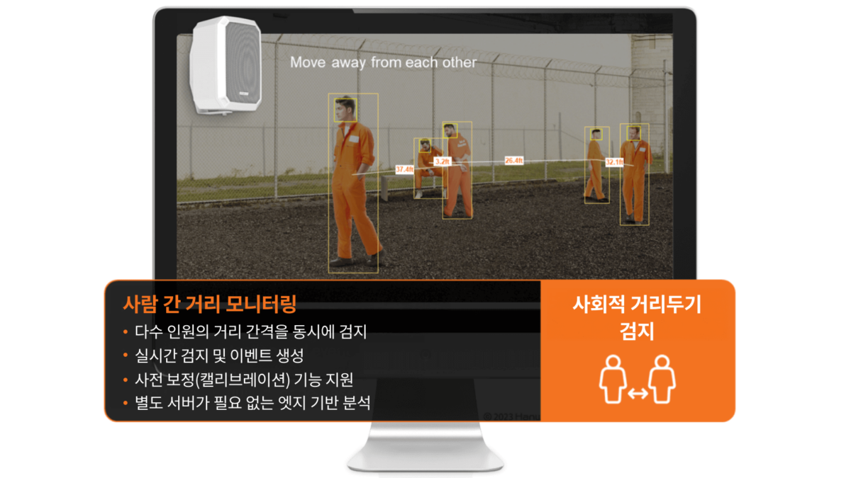 사회적 거리두기 검지 기능은 여러 사람 간의 거리를 실시간으로 모니터링하여, 사전에 설정된 기준 거리 위반 여부를 자동으로 판별합니다. 거리 기준을 사전 보정한 후에는 시스템이 지속적으로 간격을 측정하며 임계값을 초과할 경우 즉시 이벤트를 발생시킵니다. 모든 처리는 엣지 기반 AI 분석으로 수행되며, 별도의 서버 없이도 빠르고 안정적인 검지 성능을 제공합니다.