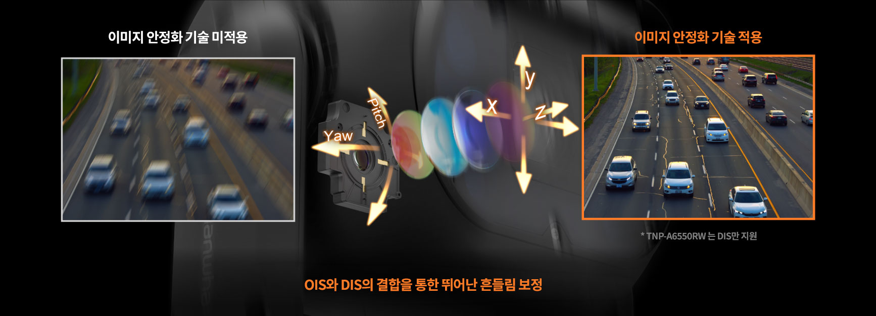 한화비전 카메라는 디지털 이미지 안정화(DIS)와 광학 이미지 안정화(OIS) 기술을 통해 흔들림으로 인한 모션 블러를 최소화하고,다양한 설치 환경에서도 일관된 영상 품질을 구현합니다.